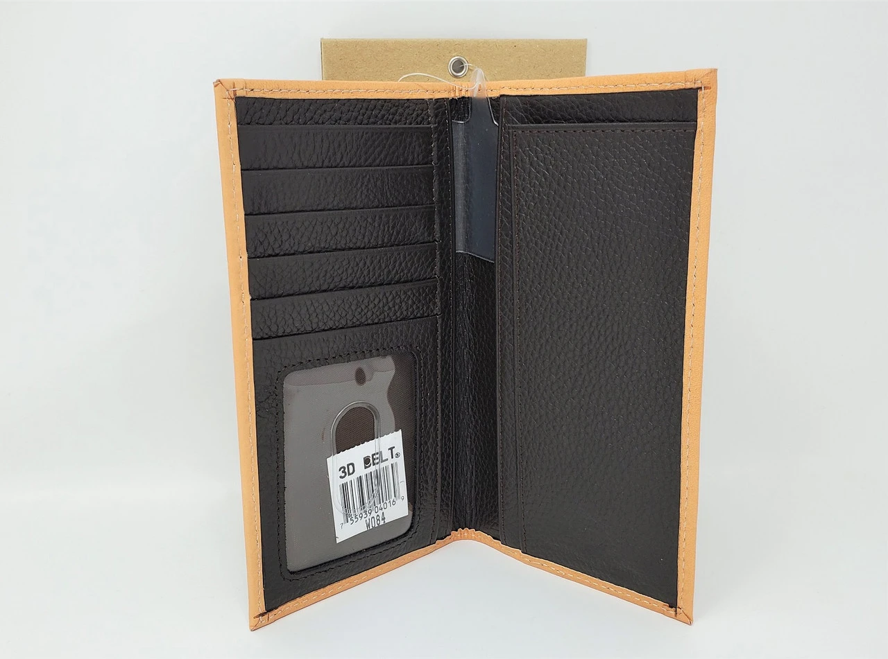 Tan top grain leather rodeo wallet from 3D. Features an ostrich print,credit card slots, bill compartment, easy remove ID holder and a checkbook holder.