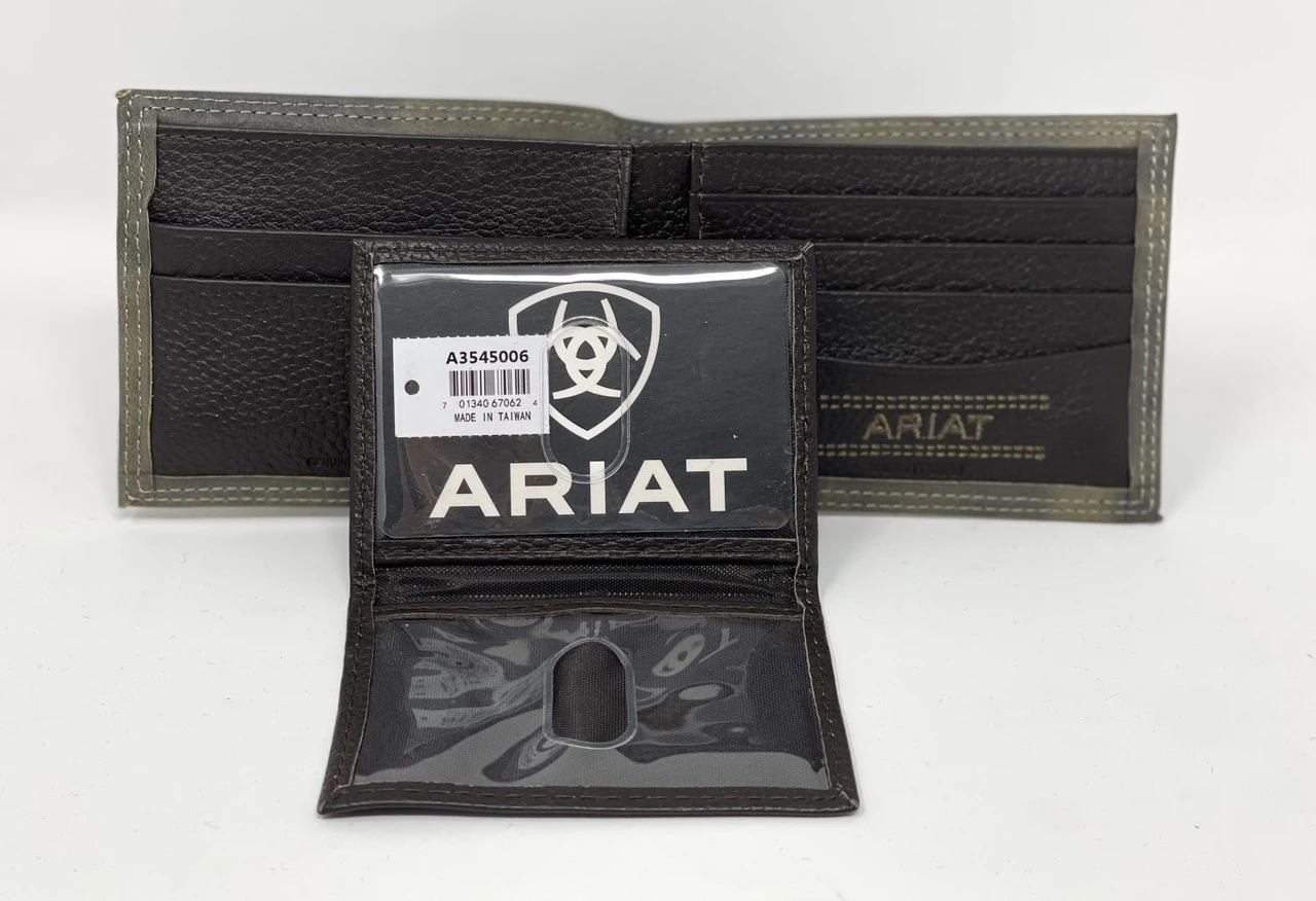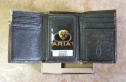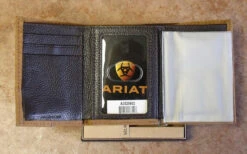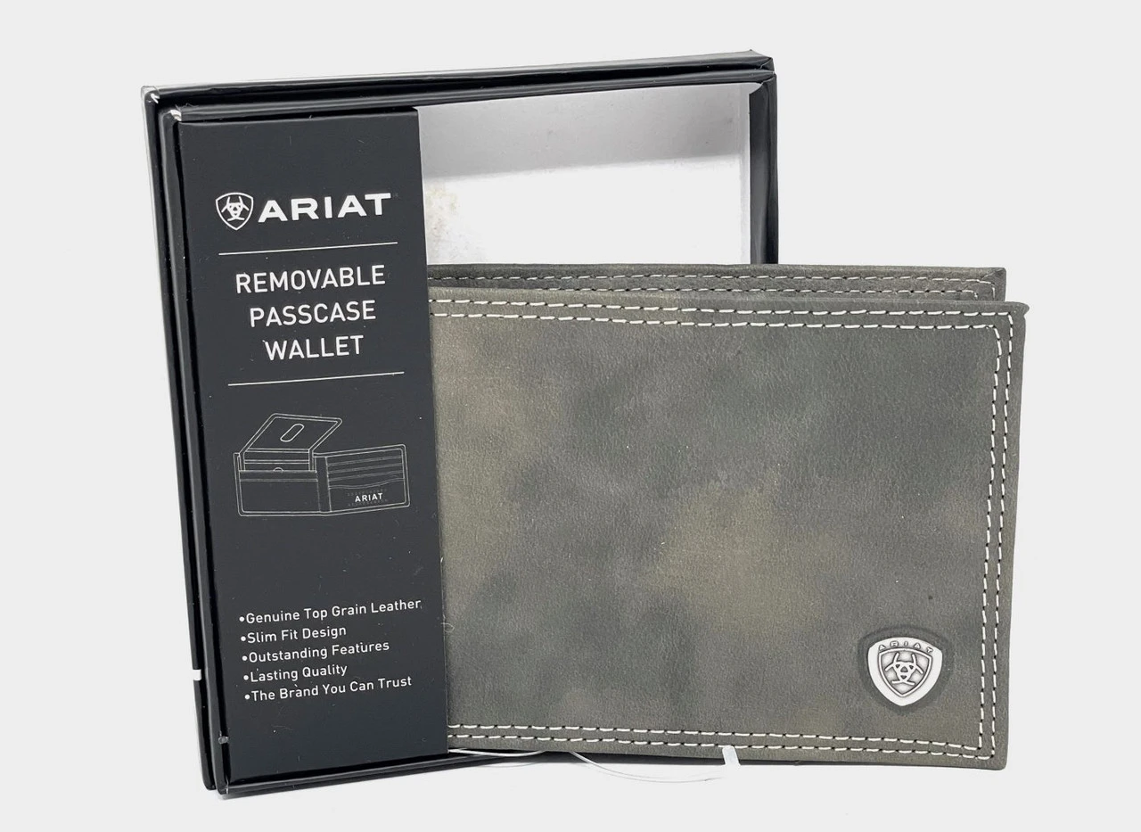 Genuine top grain, gray leather Tri-fold wallet by Ariat. Features include heavy duty stitching, metal Ariat shield, credit card slots and a removable passcase.