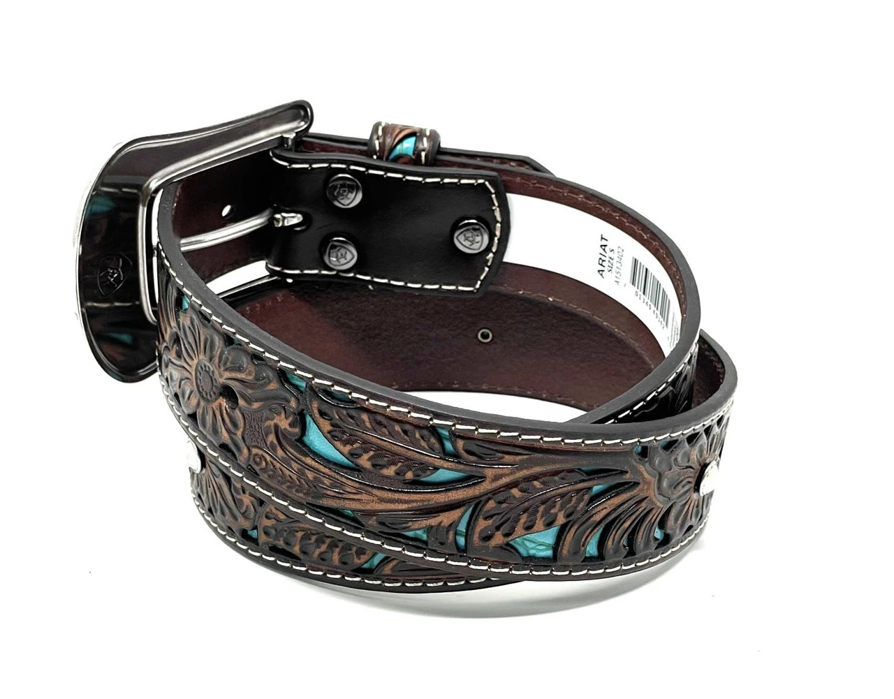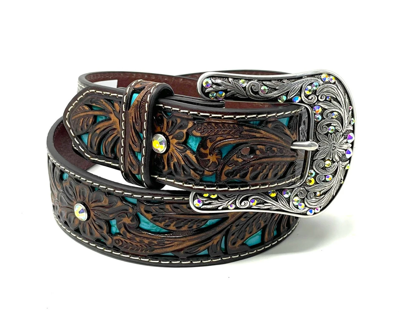 This beautiful Ariat genuine leather belt has a brown strap with turquoise inlay. The 1 1/2″ belt and the removable buckle are both set with dazzling rhinestones.