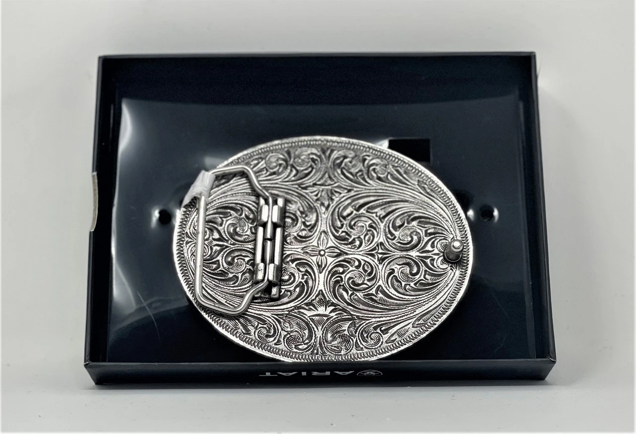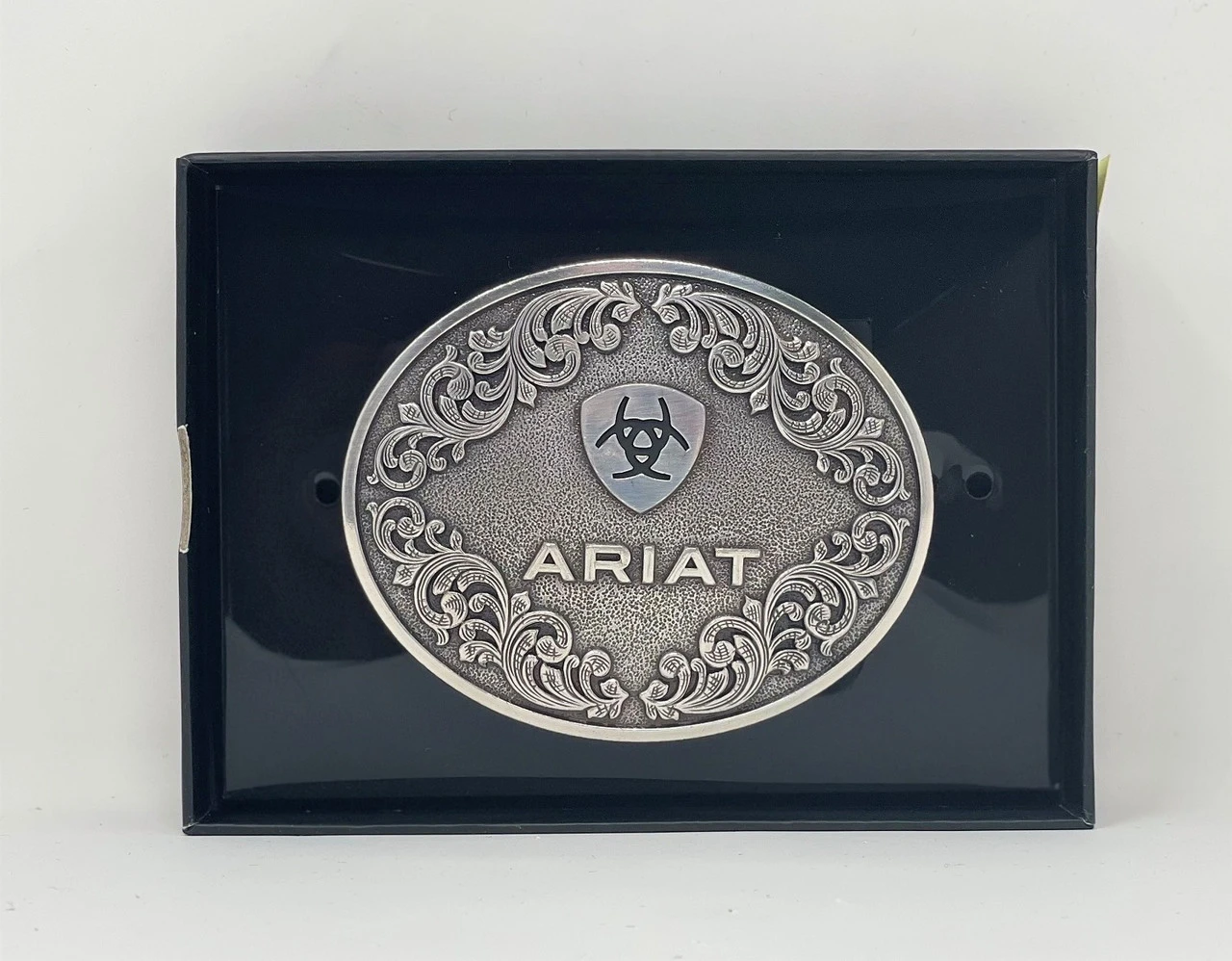 Ariat silver tone oval belt buckle featuring the Ariat logo.