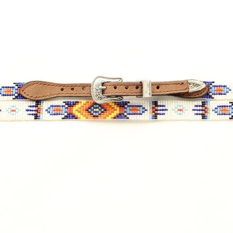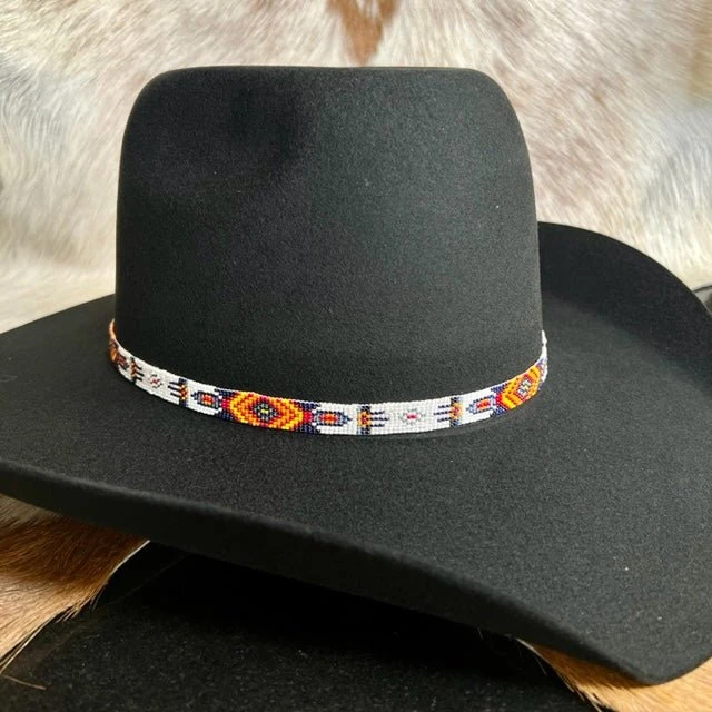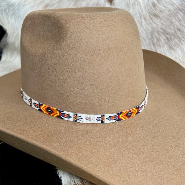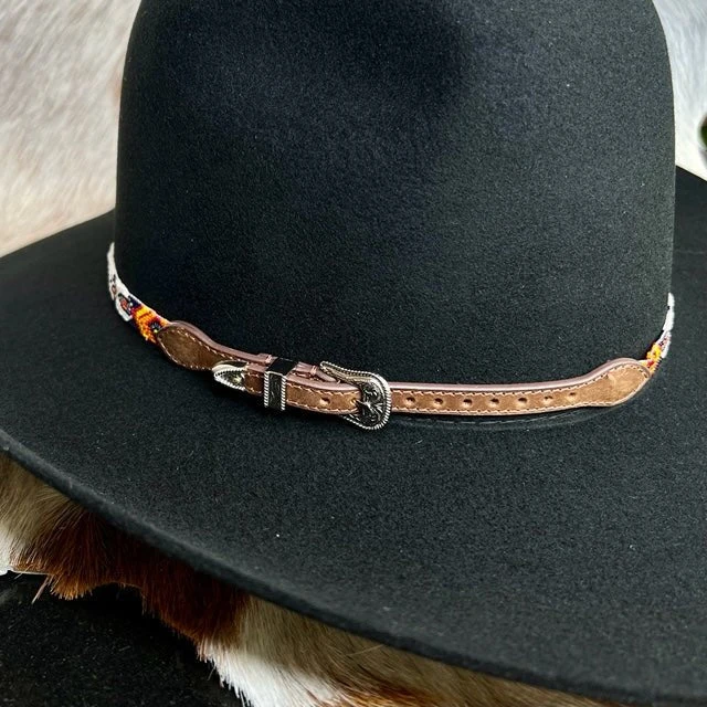 A great western hatband for the fashionable cowboy. This very unique hatband by M&F Western Products features a bright orange, blue and white band with medium brown genuine leather tabs. This hatband uses a belt style adjustment with a floral accented silver buckle.