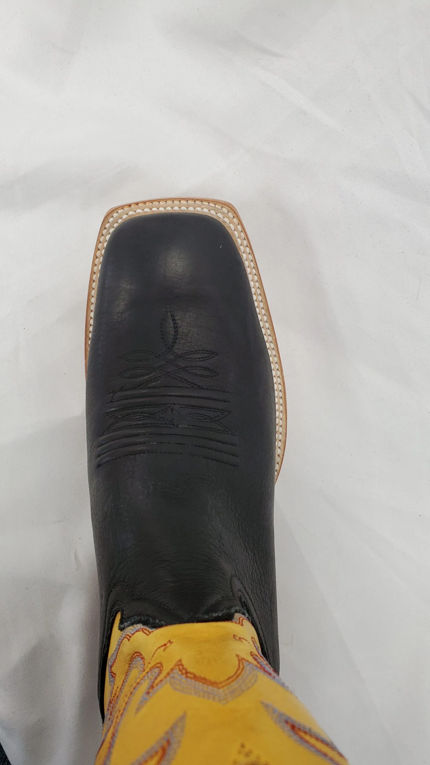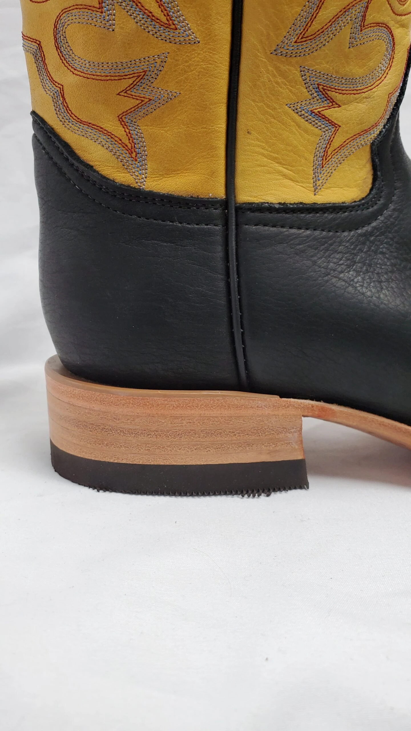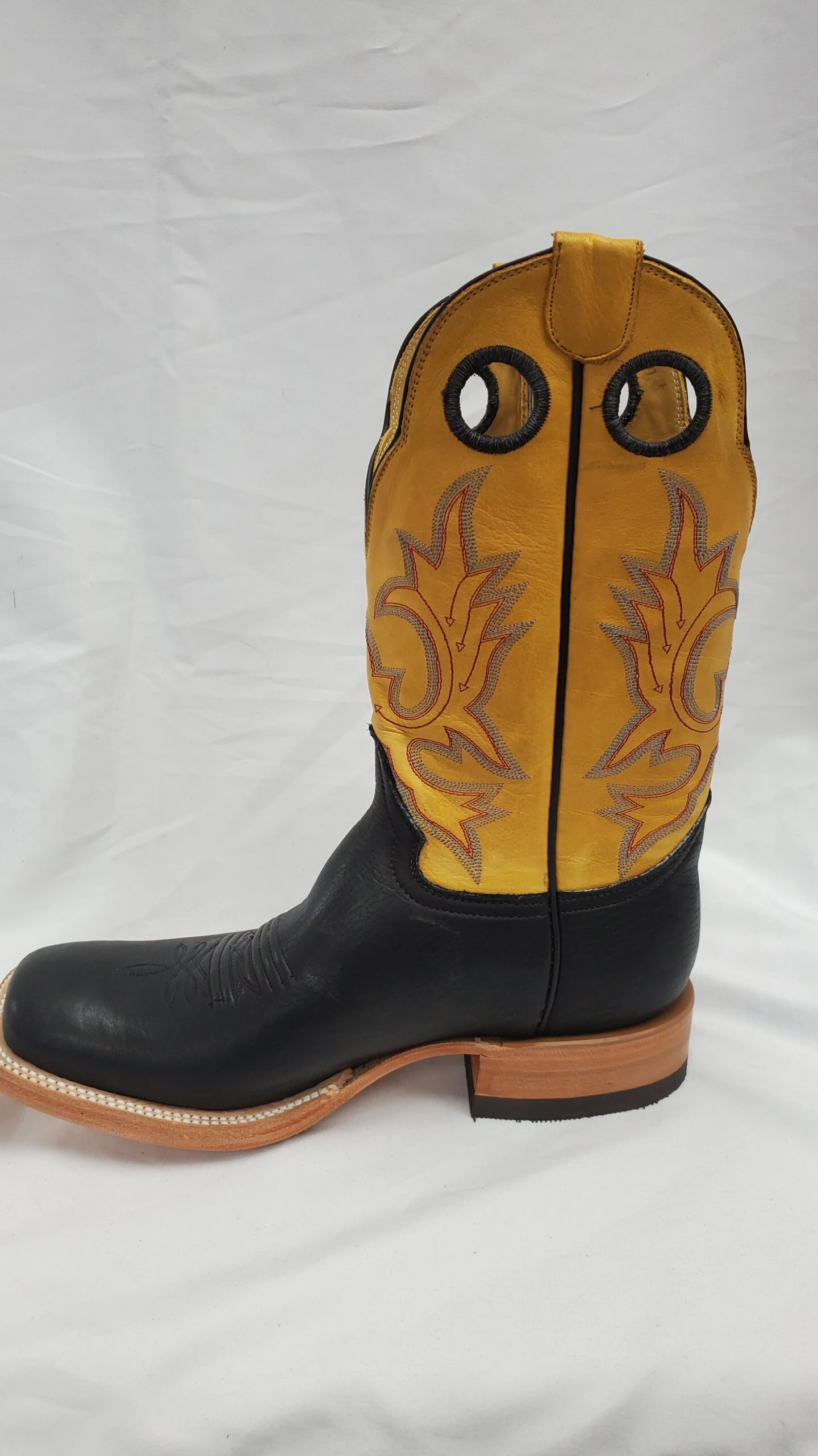 Hand made and all leather cowboy boot made in the USA. Soft, strong and comfortable buffalo leather on the vamp with cow leather top. Square toe with a double welt and a roper heel.
