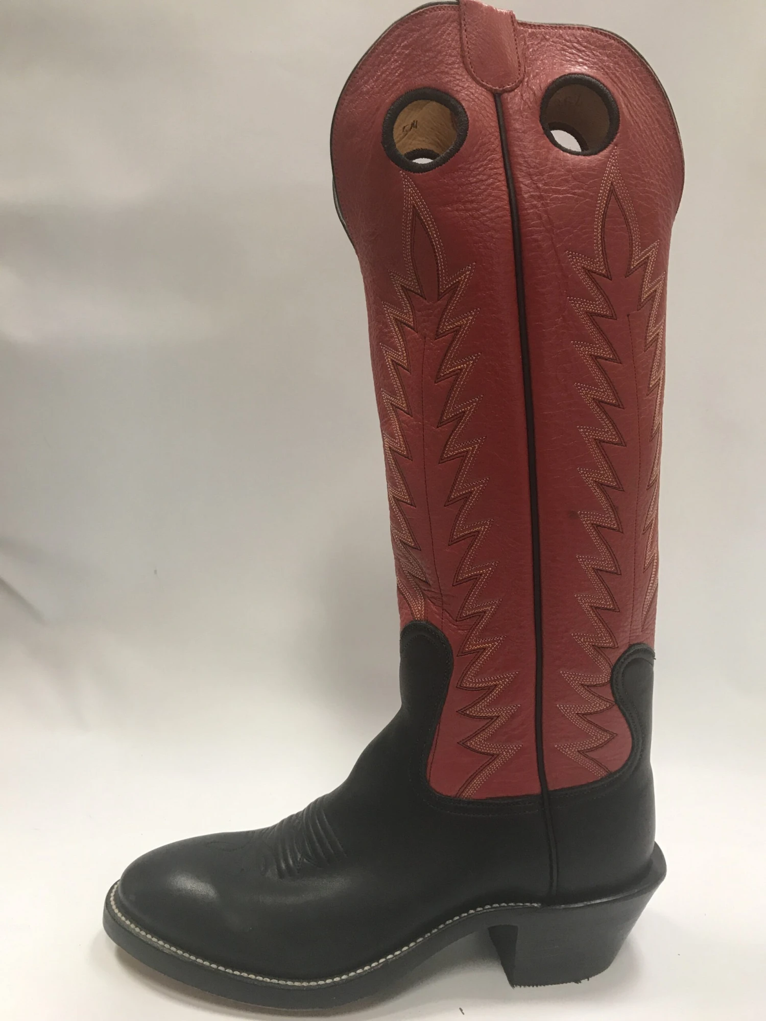 Western Boot with Black Mulehide vamp; 17″ Red Top; Double Leather sole and Pull Holes. 2 1/4″ Heel with spur ride.