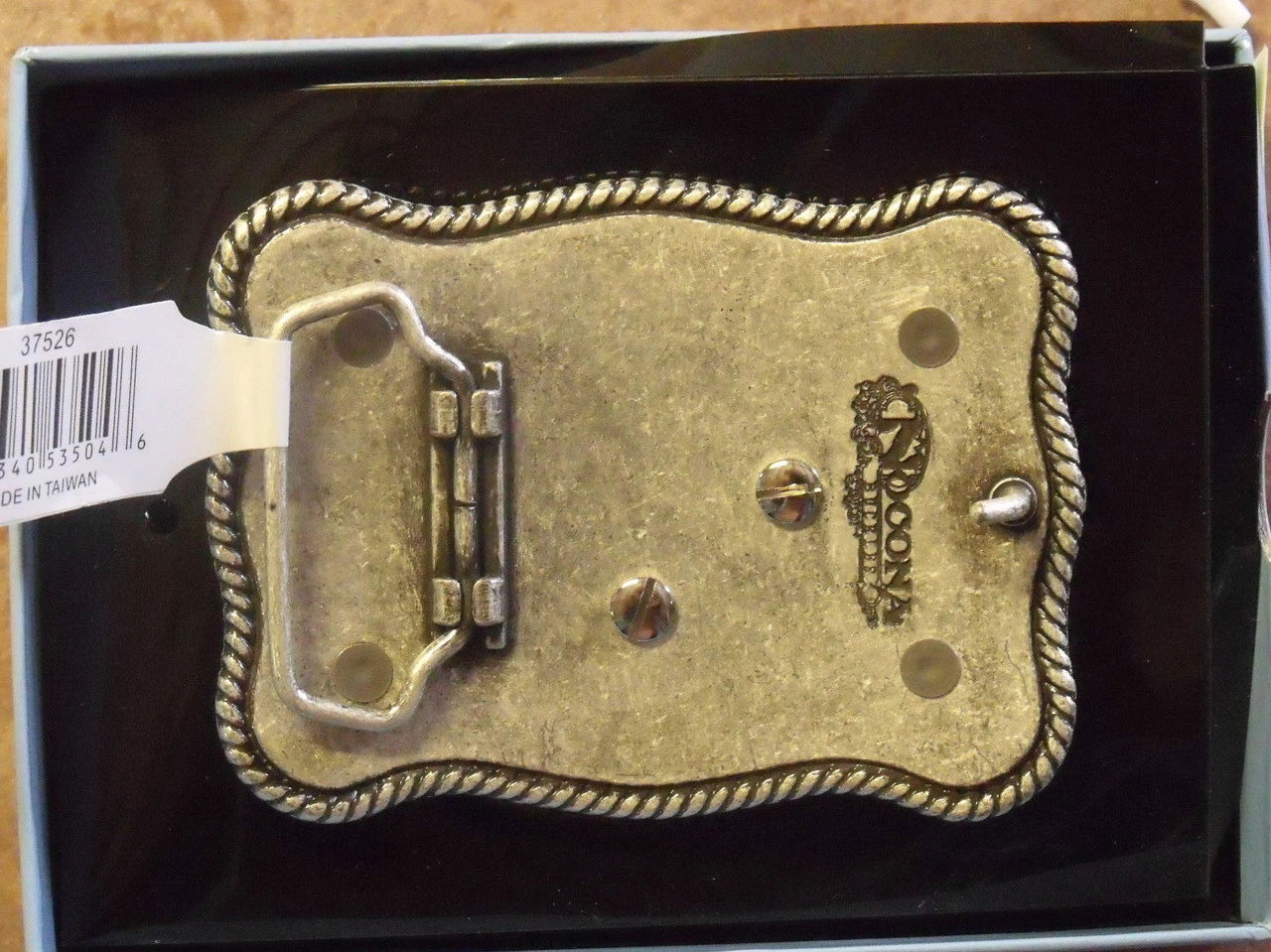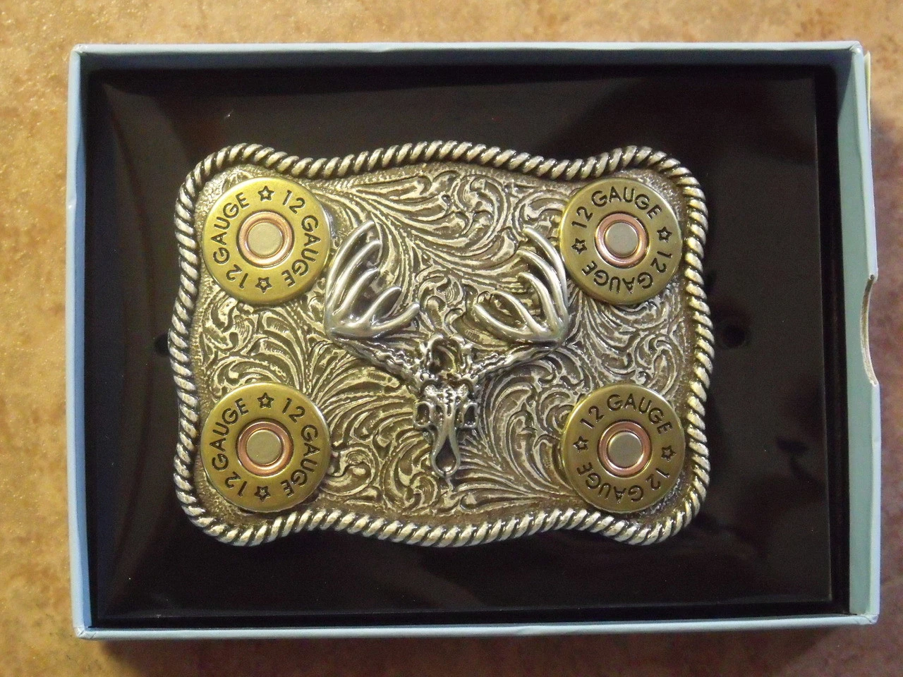 Nocona belt buckle featuring a rope edge, deer skull and four 12 gauge shotgun shells.