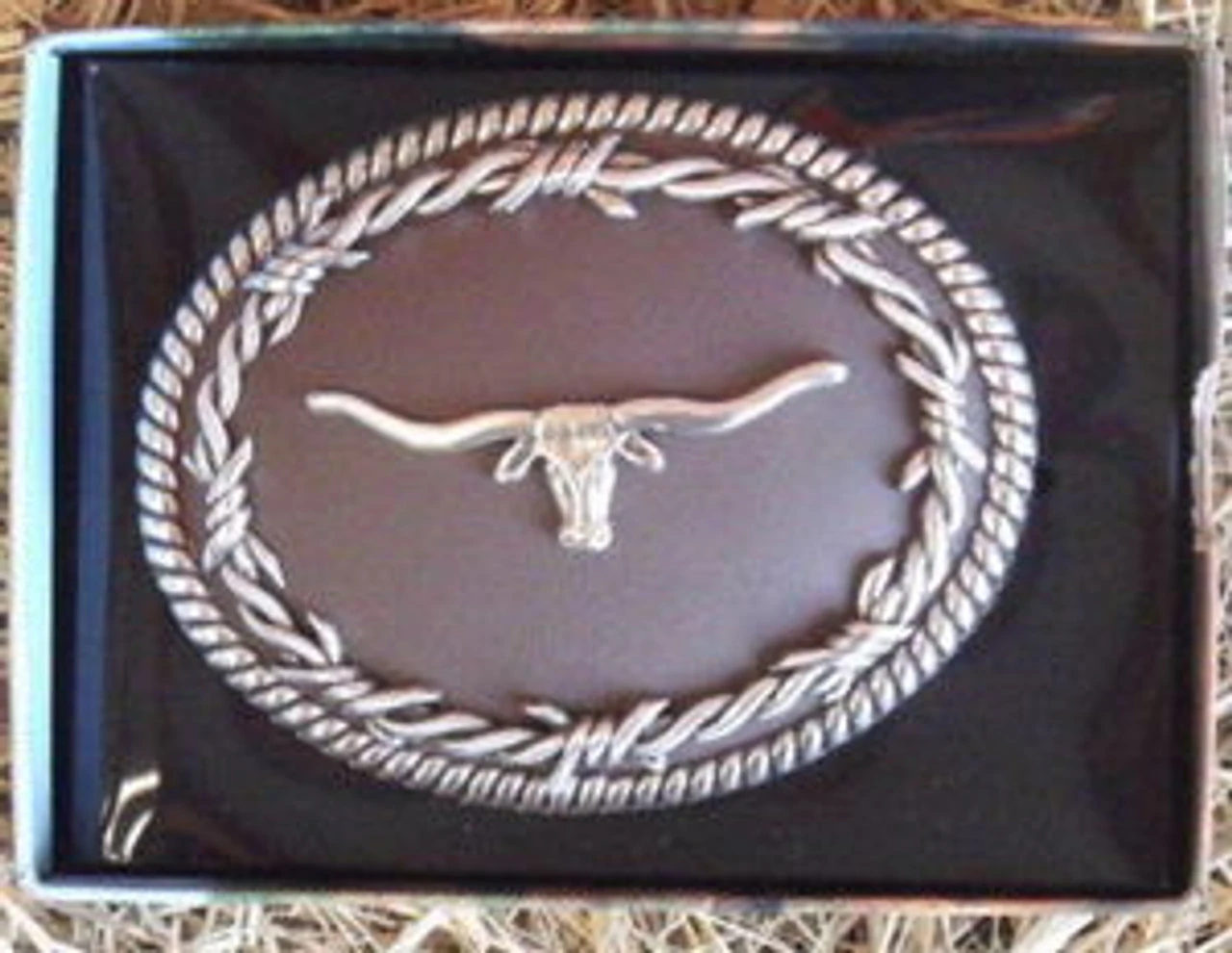 Awesome looking buckle by Nocona in silver tones featuring a longhorn surrounded by barbed wire on a brown matte background. It comes boxed, measures 3 1/4″ X 4″ and will fit belts up to1 3/4″ wide.