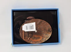 Great looking buckle by Nocona in pewter like and gold tones features a berry edge and bull rider. It comes boxed, measures 2 3/4″ X 4″ and will fit belts up to1 1/2″ wide.