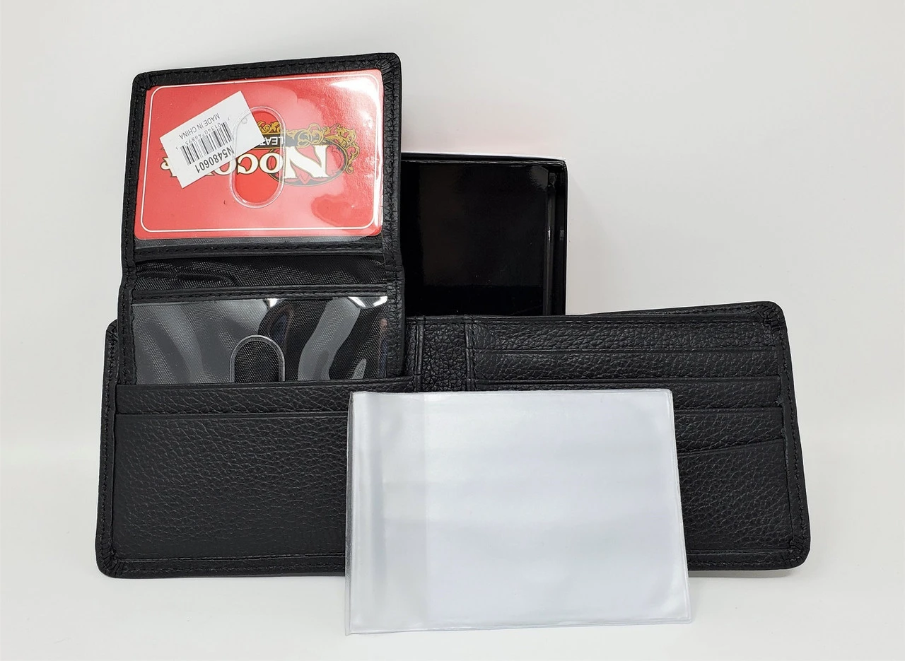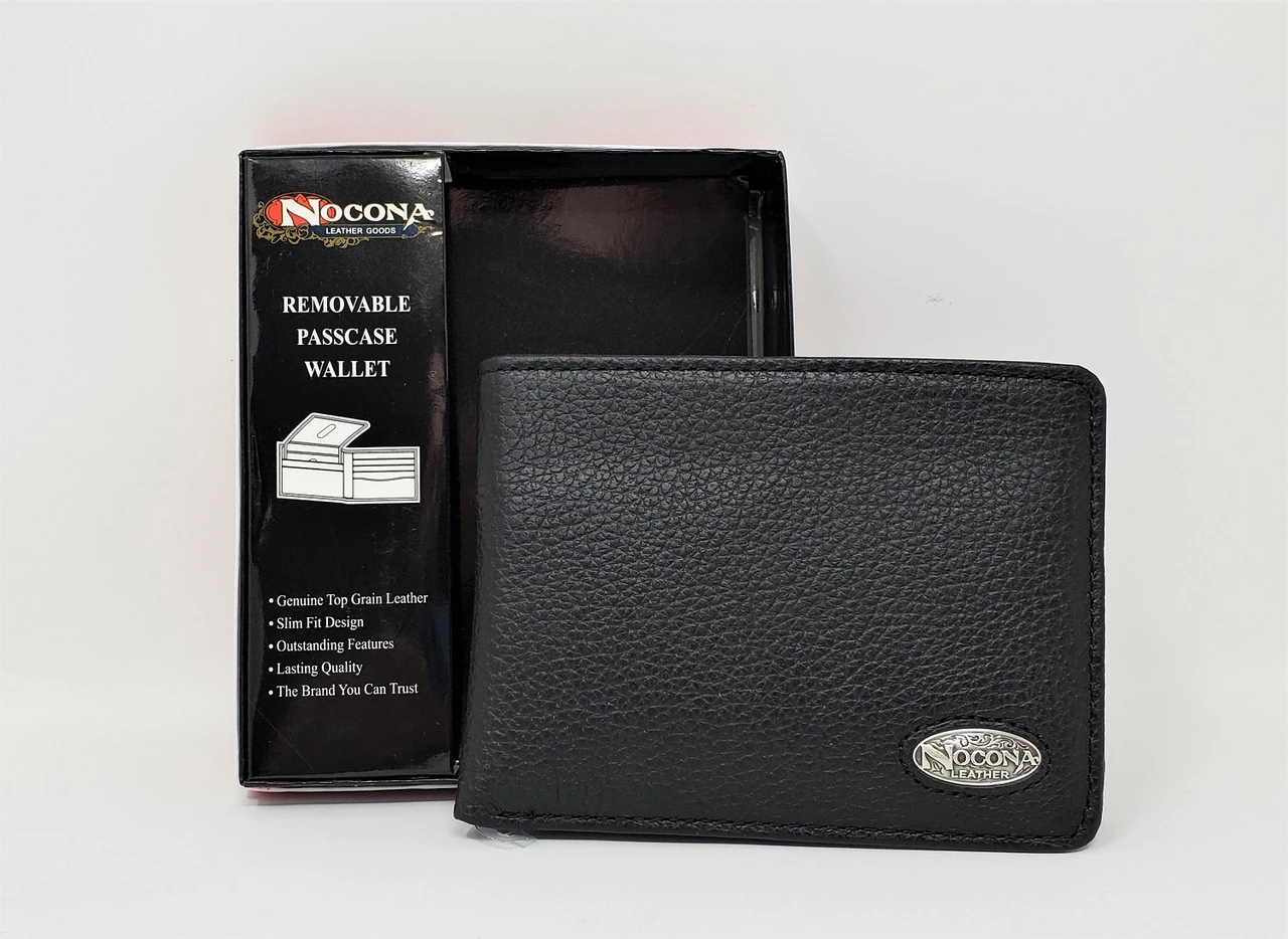 Top grain black leather bi-fold wallet from Nocona. Features include heavy duty stitching for durability, removable pass-case, credit card slots and a picture holder.