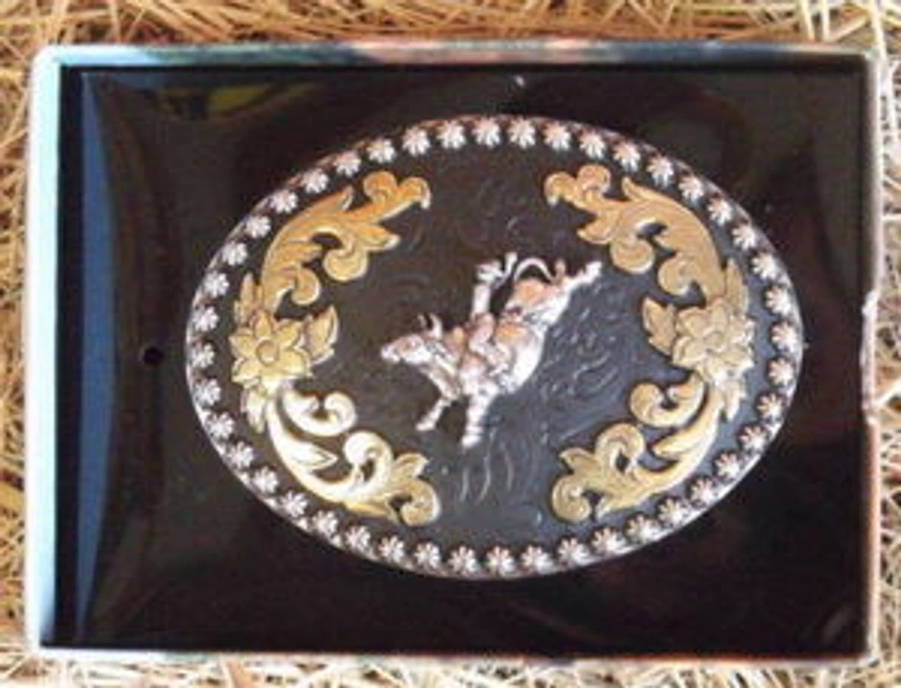Awesome looking buckle by Nocona in gold and silver tones featuring a bull rider on a black matte background. It comes boxed, measures 2 3/4″ X 4″ and will fit belts up to 1 1/2″ wide.