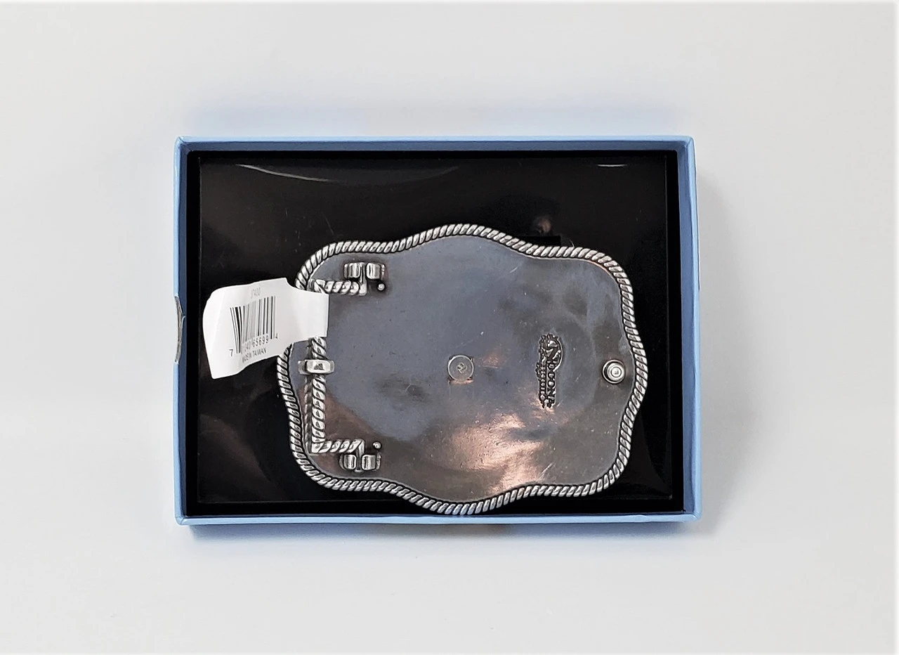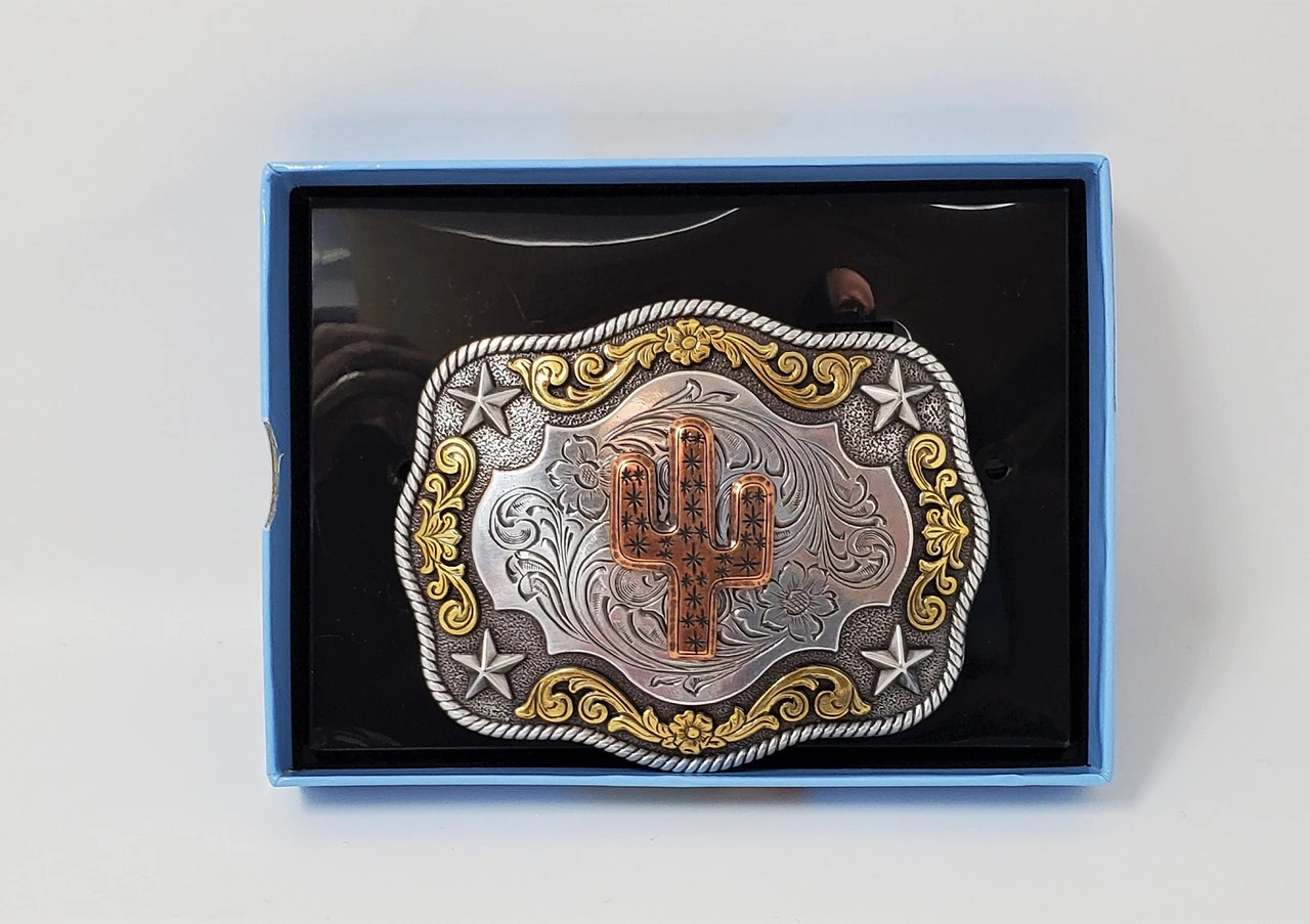 This multi-layered buckle by Nocona features copper saguaro cactus on a silver tone backing with gold floral scrolling. It measures 3 1/4″ x 4″ and will fit belts up to 1 1/2″ wide.