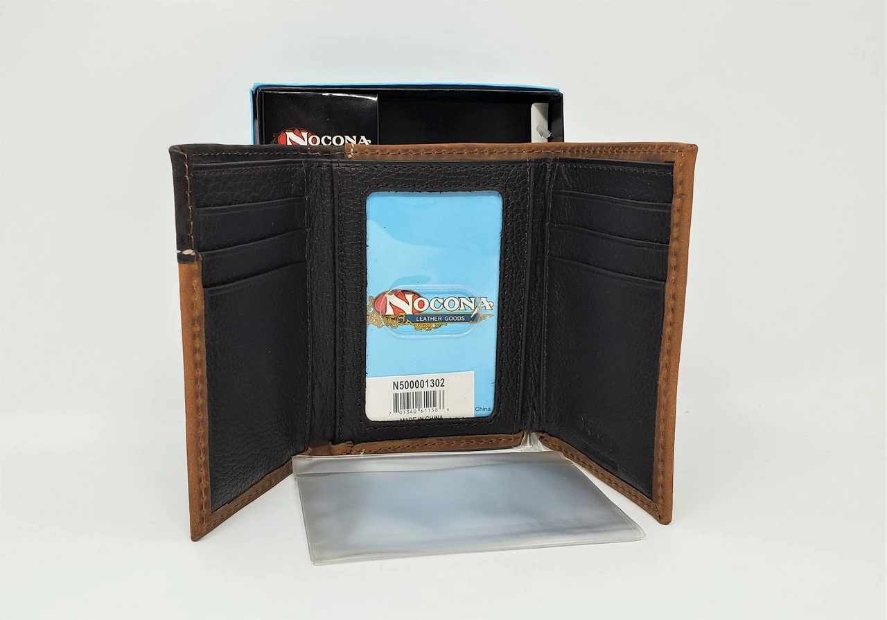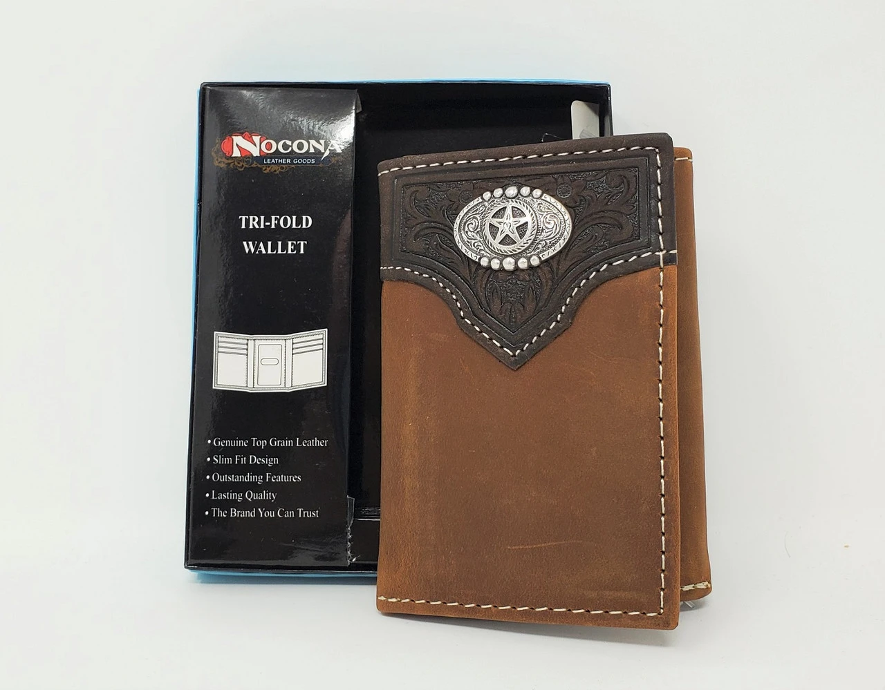 This brown tri-fold wallet from Nocona is made to last. Constructed of top grain distressed leather it features an embossed leather overlay and a metal oval star concho.