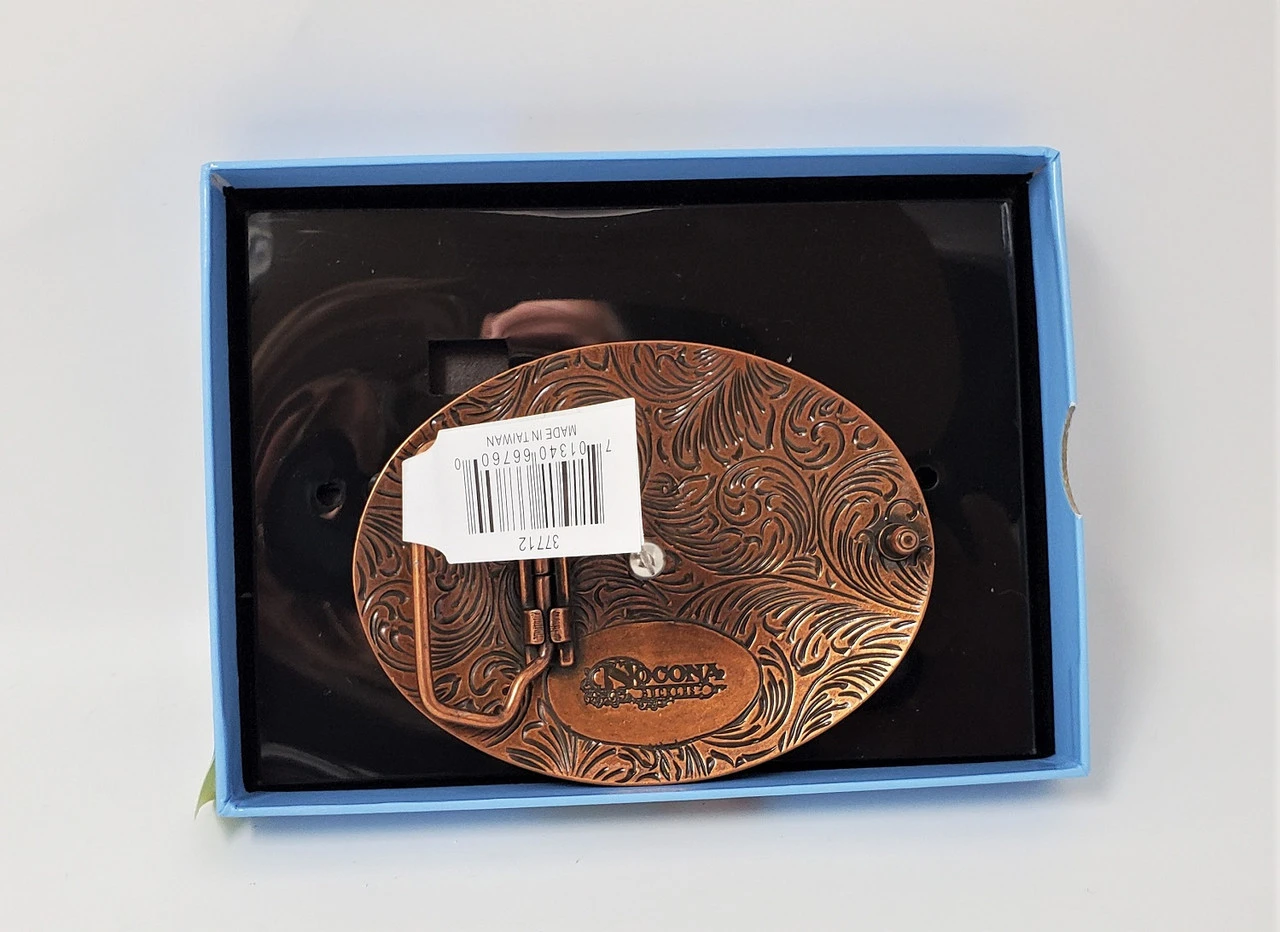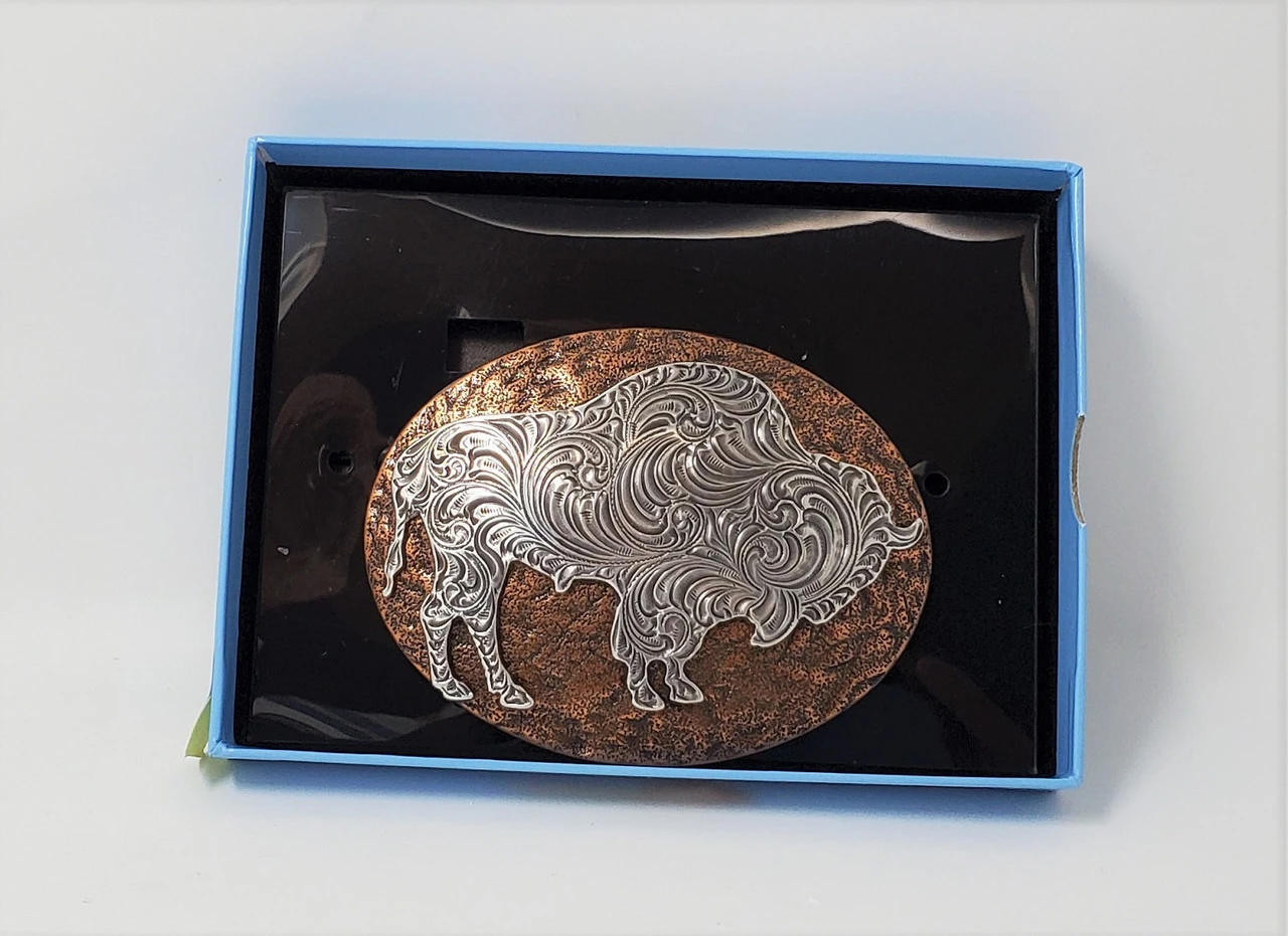 Silver tone buffalo on hammered copper background buckle by Nocona. It measures 3″ x 4 7/8″ and will fit belts up to 1 1/2″ wide.