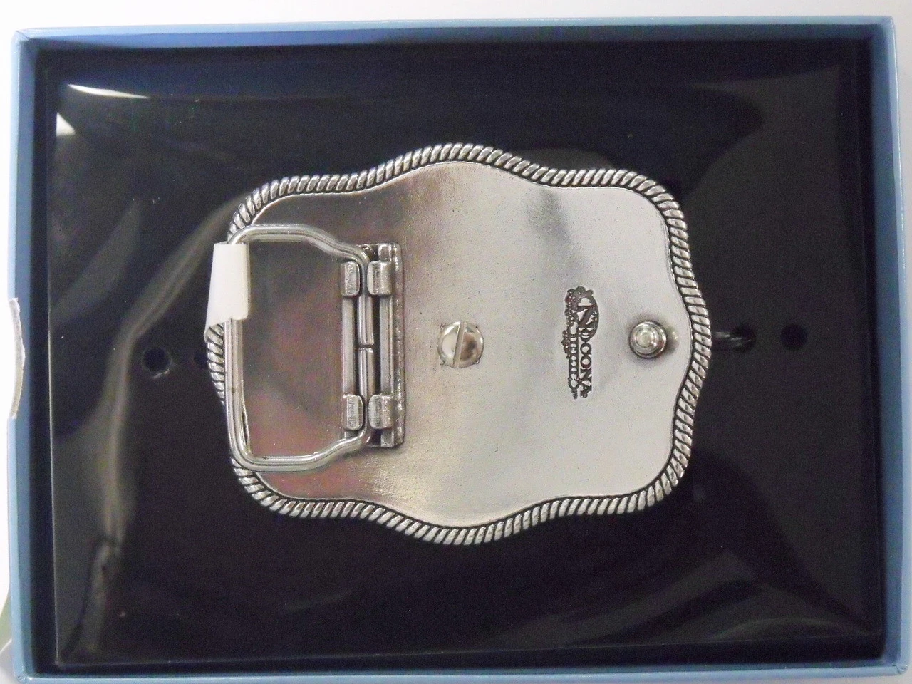 Fancy youth size buckle by Nocona in gold and silver tones featuring a bull rider and floral design. It comes boxed, measures 2″ X 2 3/4″ and will fit belts up to1 1/4″ wide.