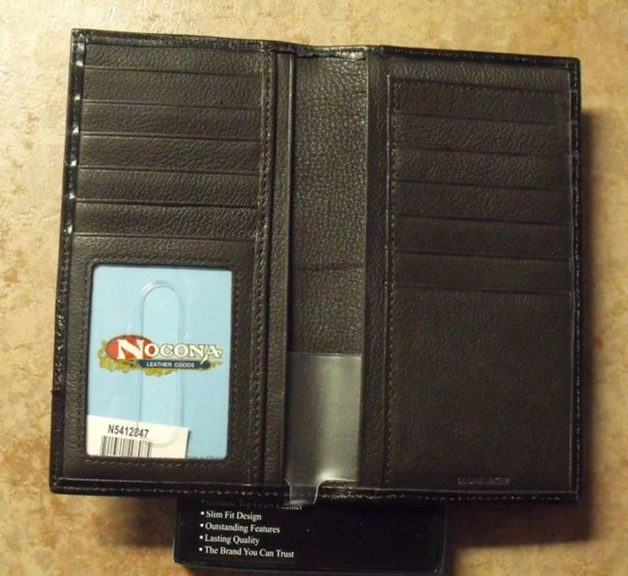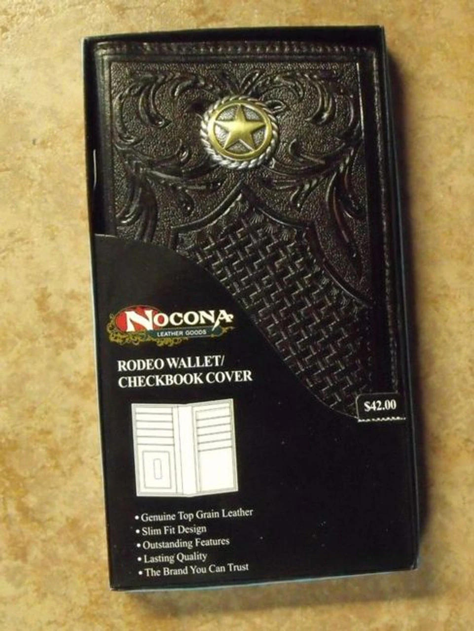 This Chocolate brown Rodeo wallet from Nocona is made to last. Constructed of top grain leather it features tooling and a metal Lone Star concho.