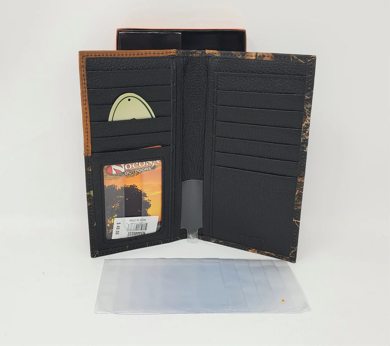 Made of genuine top grain leather this rodeo wallet/checkbook cover by Nocona is in the Mossy Oak camouflage design. It features a 12 gauge bullet on a brown leather overlay with a laced leather border.