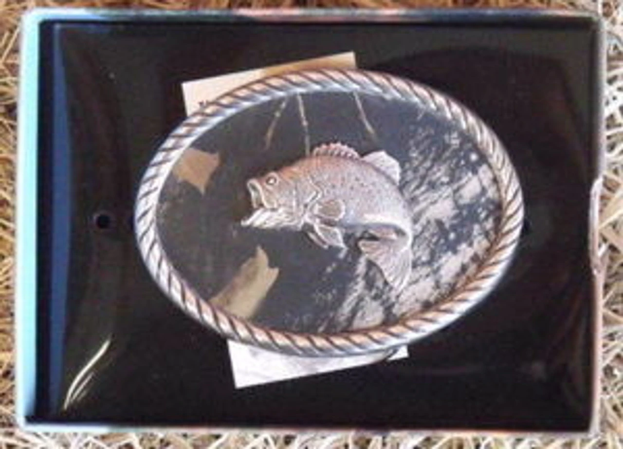 Mossy Oak buckle by Nocona features a bass on a camouflage background. It comes boxed, measures 2 1/2″ X 3 1/2″ and will fit belts up to1 1/2″ wide.