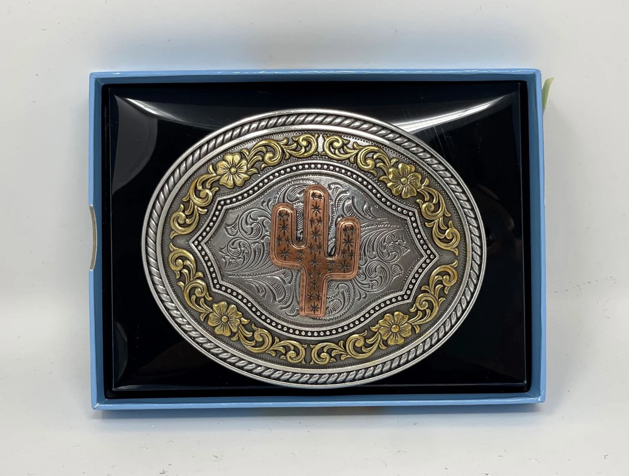 This multi-layered buckle oval by Nocona features copper saguaro cactus on a silver tone backing with gold floral scrolling. It measures 3 1/4″ x 4 1/4″ and will fit belts up to 1 1/2″ wide.