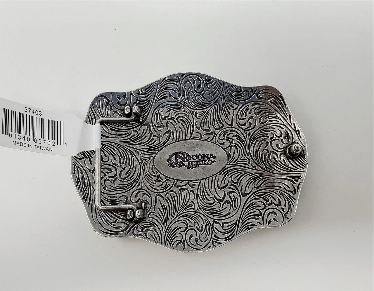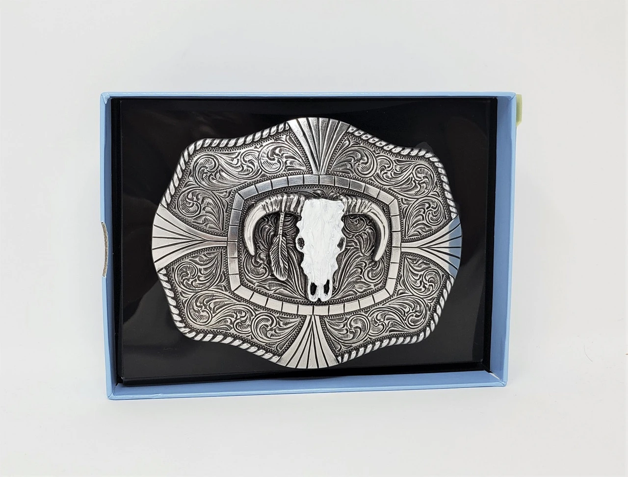 Western Steer Skull buckle from Nocona measures 3 3/8″ x 4 1/4″ and will fit belts up to 1 1/2″ wide. It features rope edging, scrolling and a white skull.
