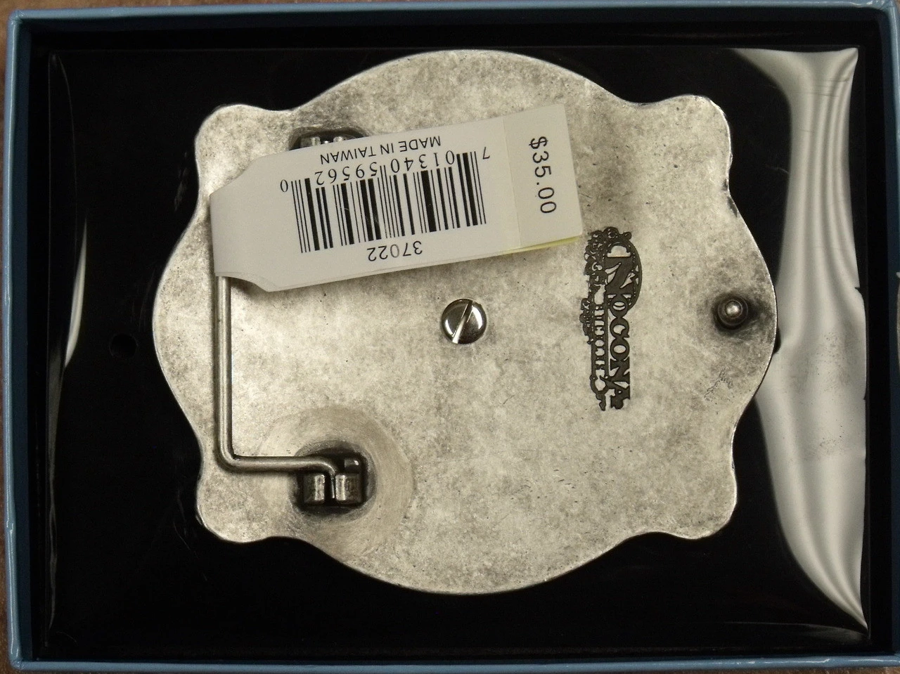 This fancy Team Roper buckle from Nocona measures 3 1/4″ x 4″ and will fit belts up to 1 1/2″ wide. It features faux turquoise studs, berry edging and gold tone scrolling.
