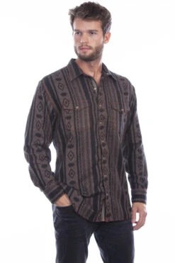 This is a sharp looking mustard colored shirt from Scully’s Signature Series. Made of 100% cotton it features snap front & cuff closures, two chest pockets with snap closures, and point collar. Contrasting trim and ribbon are on the inside placket, inner collar and cuffs. 100% Import.