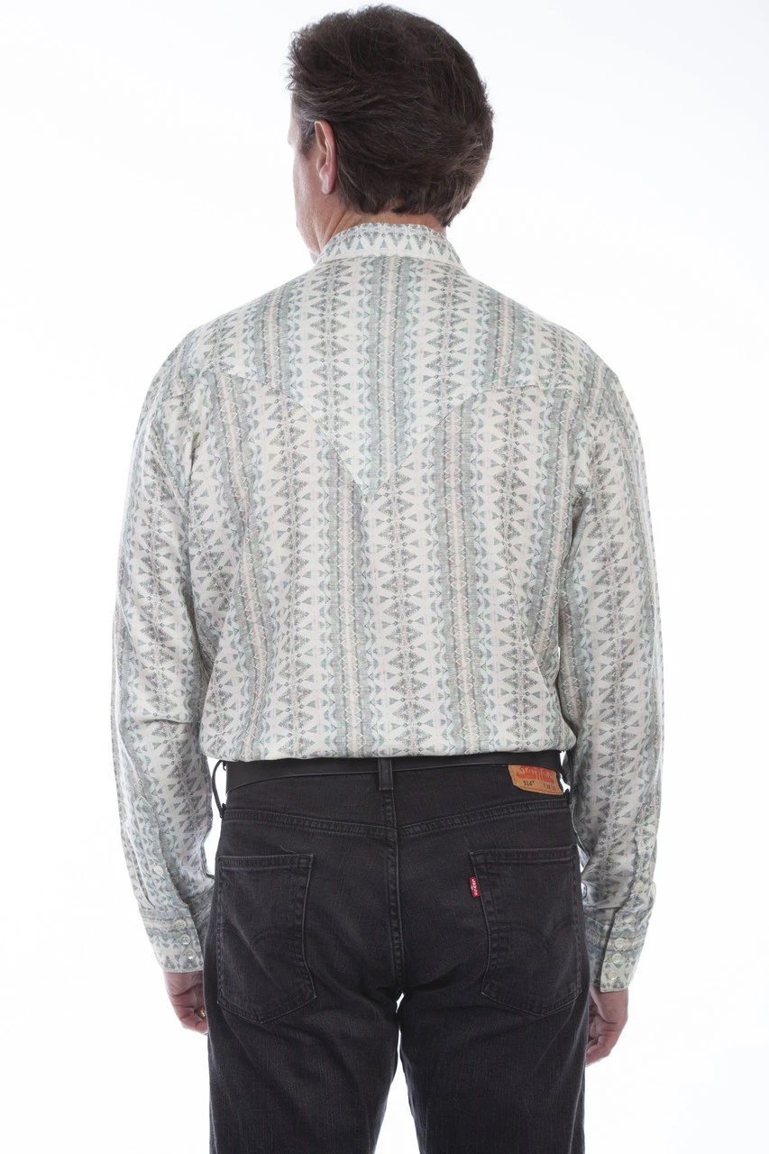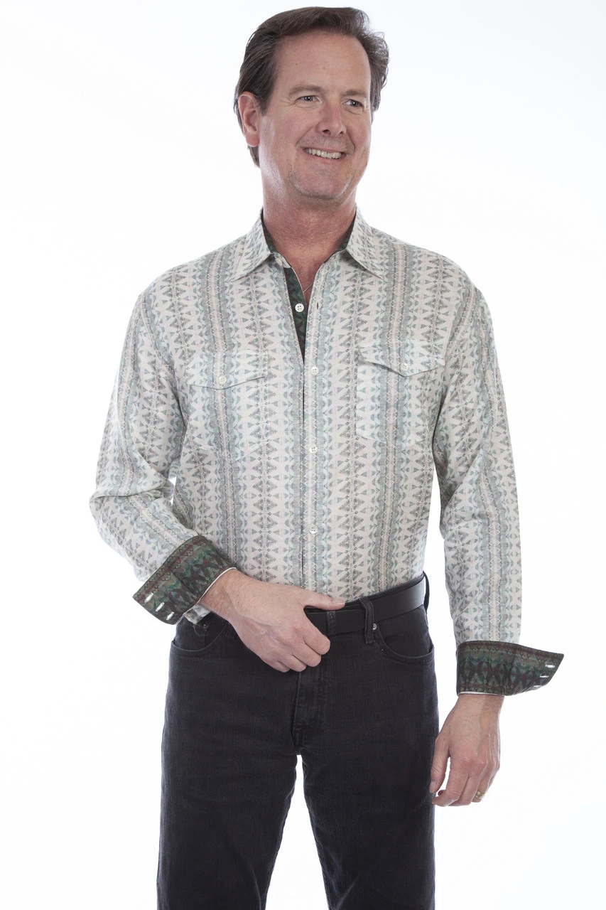 Made of 100% tencil this men’s western shirt is from Scully’s Signature Series. It has sage colored diamond stripes and contrasting trim on the placket and cuffs. It has two chest flap pockets with button closures.Â