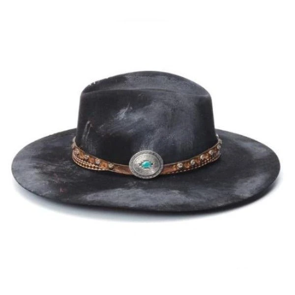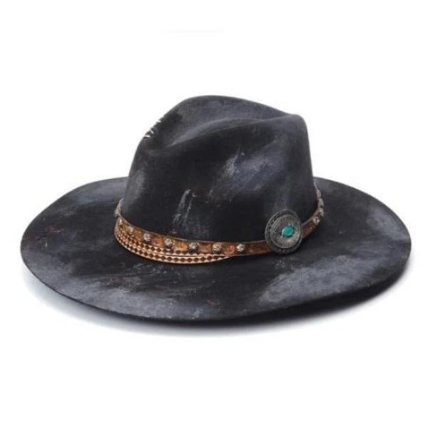 This black rancher hat is made of superior fine felt wool and its allure goes beyond its exclusive design. It comes in a distressed black color featuring a stiff brim and a pinchfront crown. The hat grabs attention with an embellished, studded band with a silver and turquoise concho on the side. Perfect if you love the vintage look with a modern touch.