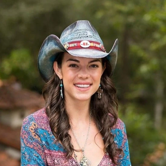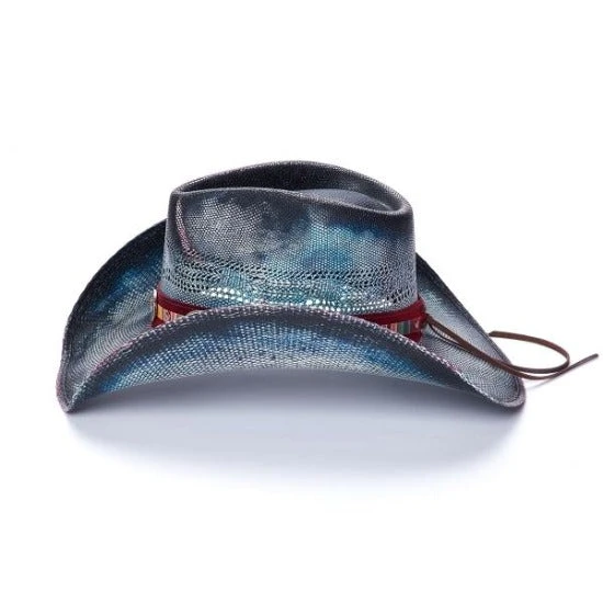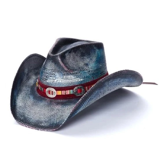 The Southwest blue cowboy hat, from the Stampede collection, allows you to show your sense of style and individuality. Featuring a teardrop style crown and a unique blue stain, this hat is a rare beauty. A maroon hat band sits at the base of the crown, decorated with a multicolored ribbon and silver conchos. It’s also vented to keep you cool as you enjoy your time wearing this hat.