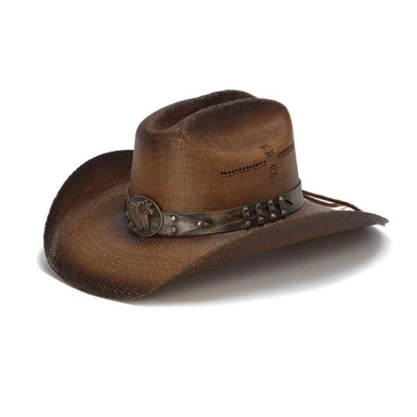 The Horse lover cowboy hat is a special rustic hat made from genuine brown Bangora straw. The hat features a center dented crown with aesthetic cross layout vent holes for added style and breathability. It has a classy distressed leather band featuring stud and cutout details, and a horse face concho at the center front. In addition to being functional, the hat’s craftsmanship gives it a unique stand-out look. Look your best in this distinctive hat from the Stampede Collection.