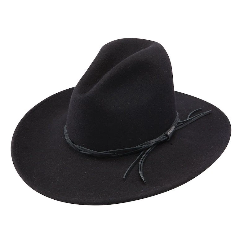 The Stetson Gus Outdoor hat is a fine cowboy hat to complete your western attire. This crushable black hat features a sloped pinch front crease crown with a 3 1/2” inch brim. It’s styled with a twisted leather hat band that will effortlessly give you that retro western look. Made in the USA, you’ll love to wear it for riding, ranching or just spending a day in town.