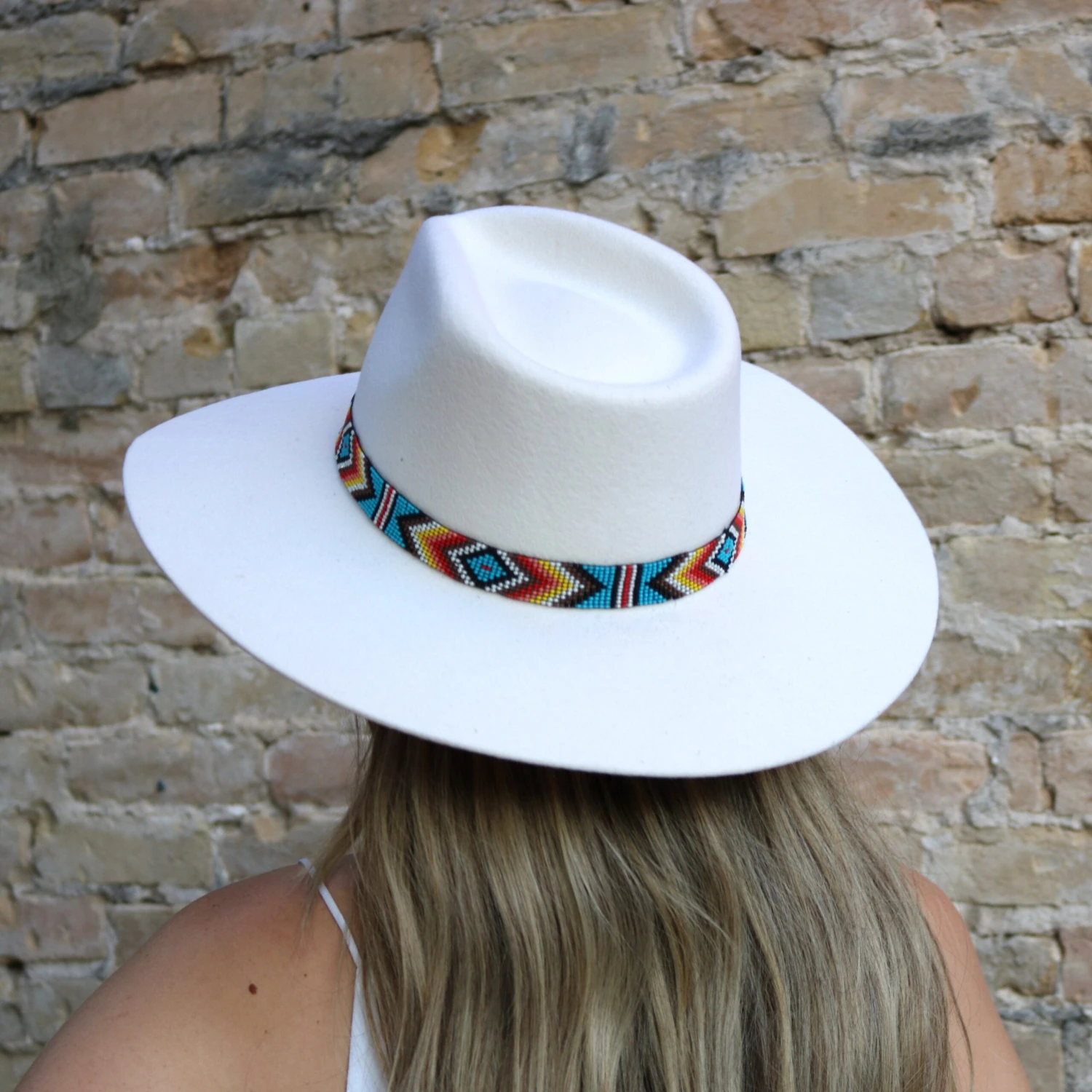 Dress up your favorite hat with this beaded hatband.Stretch to fit in a southwestern pattern of multi colored beads.
