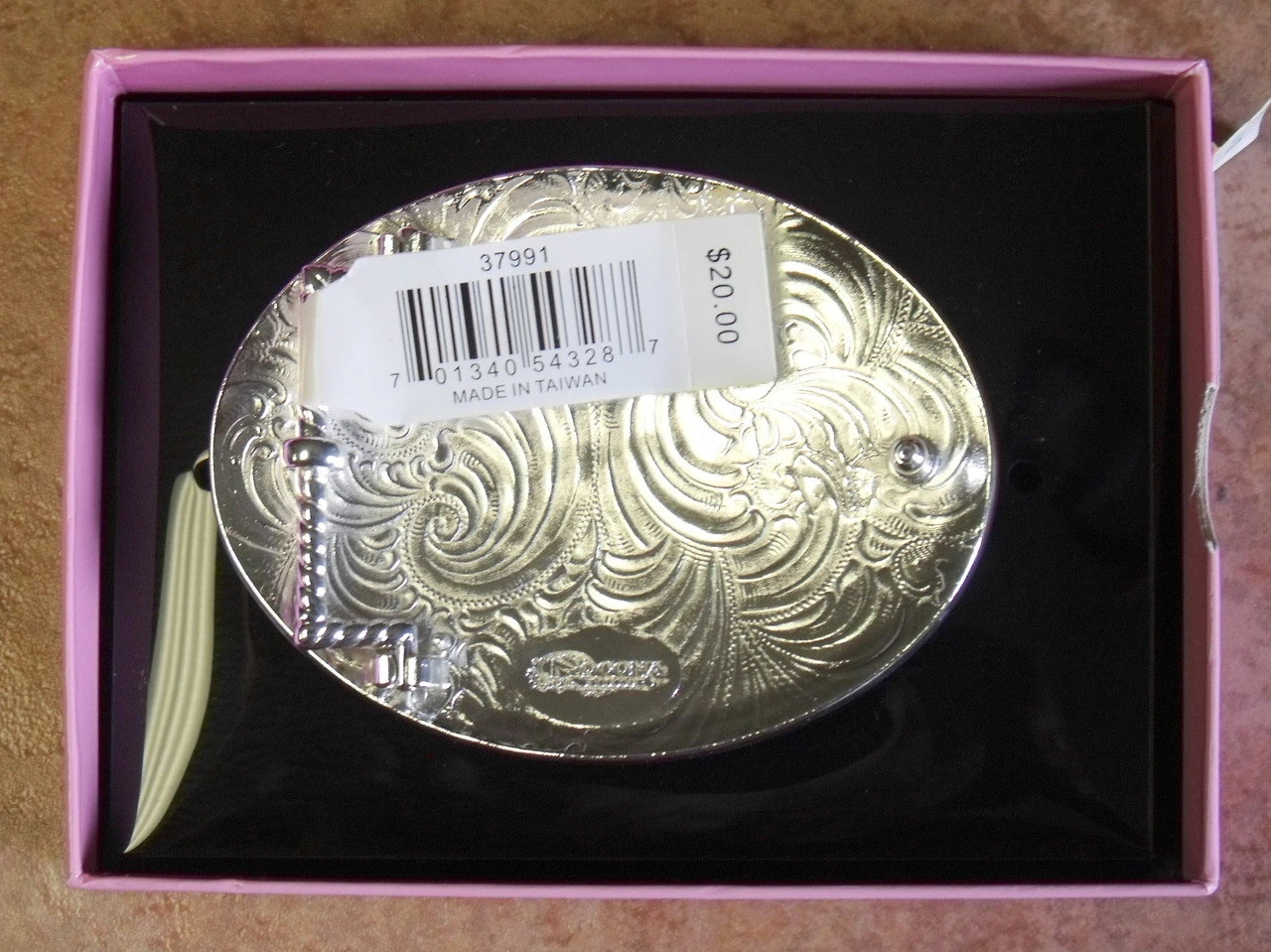 This beautiful belt buckle from Nocona is highlighted by a tribal design with a light blue background. It measures 2 3/4″ x 3 3/4″ and fits belts up to 1 1/2″ wide.